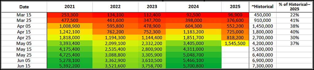 Trends for these four years and developing 2025 show a couple of interesting features. First of all, 2022 and 2023 were down years compared to 2021 and historical data. A rebound was seen 2024. The row with June 15 cumulative birds is most significant because the migration peak dates vary each year according to the progression of favorable climate conditions. Cumulative migration totals by June 15 were below 80% of the historical average in every year with the 2022 – 2023 period showing levels of ~50% of historical average. Based on 2025 results-to-date, it’s shaping up as a slow start for this season, much like 2022 and 2023.