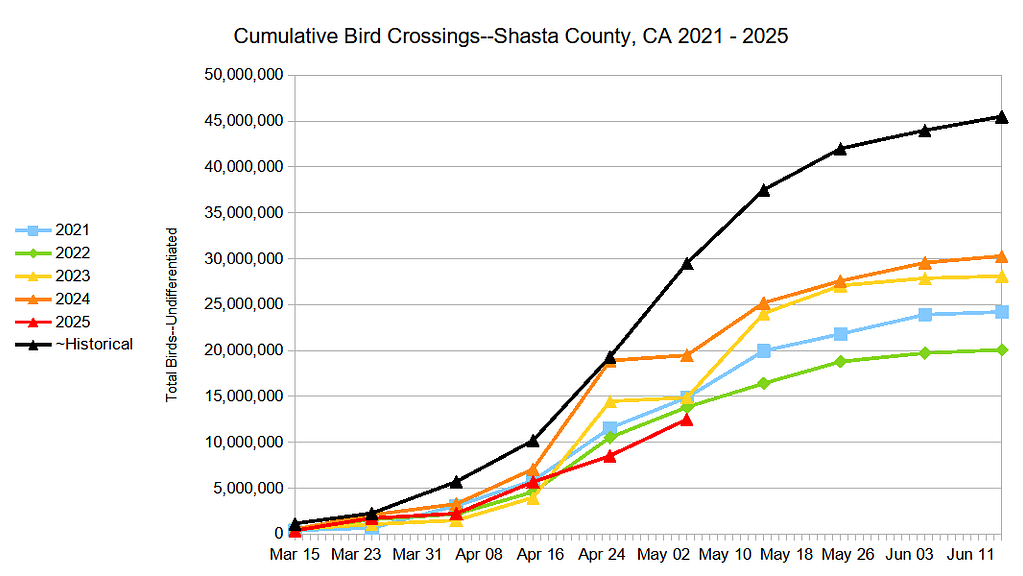 The question that the reader might ask is if Kootenai County is in any way representative of the U.S. as a whole? The first check on that was to compile the data for Shasta County (Redding) which is located along the Sacramento River flyway where I have done a bit of birdwatching in the last two years. The migration there involves approximately 5 – 10x the number of birds I see at home. Sadly, corroborated by my trip there around April 1st, Redding’s migration is also sub-par for every year shown (updated to May 5, 2025):