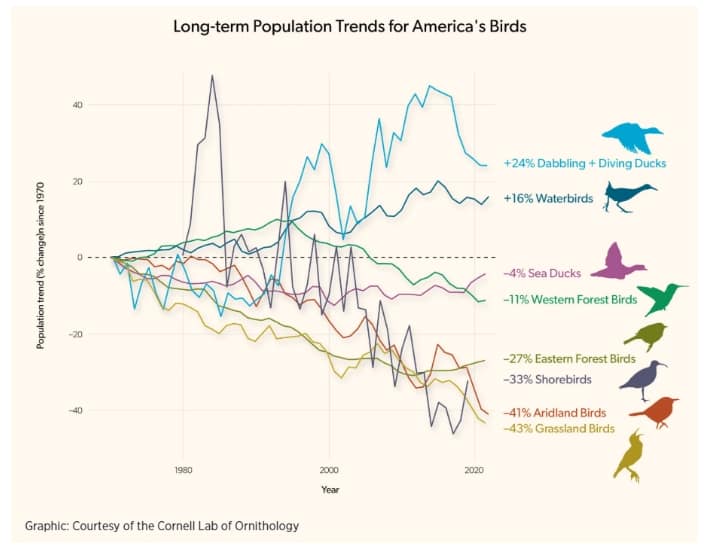 Certainly, the first couple of factors are huge. The last item is kind of ridiculous. The Audubon Society advocates for wind and solar power, but the 2025 NABCI report specifically mentions negative solar development impacts on certain arid land bird species. Its main focus on the web page seems to be to get you to sign up and donate. It reminds me of the NRA or AARP. There are plenty of published studies on the deleterious effects of electromagnetic fields and non-ionizing radiation on insects and birds. Windmills and solar panel farms create hazards for birds and create deserts for any life whatsoever. A drive south of Las Vegas on US95 to Parker, AZ will give you a glimpse of a solar farm desert. A drive on I-84 along the Columbia gorge will provide a display of hundreds of windmills, featuring toxic blades, tons of imported rare metals for the turbines, and surrounding areas exposed to deadly low-frequency ground energy.