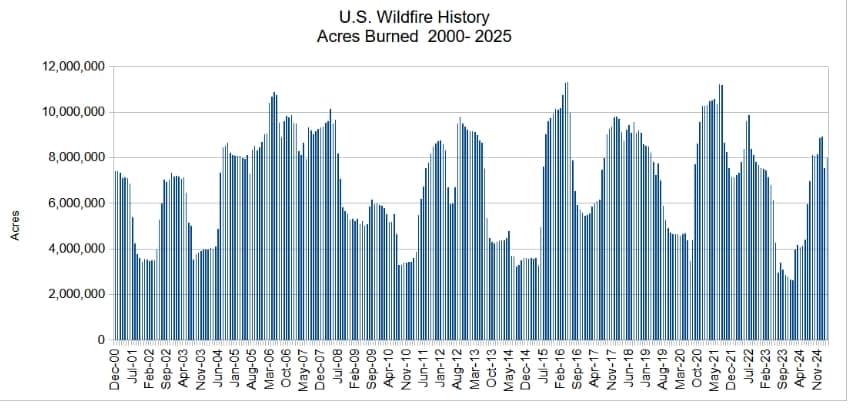 To be sure, the period of late summer 2020 to early 2023 was pretty active with high-profile California fires, but there were periods of similar activity earlier in the century.