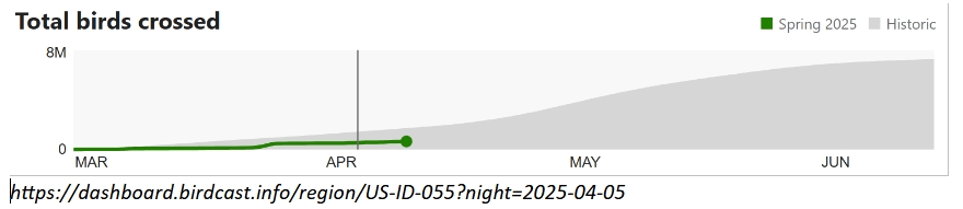 Birdcast’s Migration Dashboard is an interesting tool that shows all kinds of data about each year’s migration by U.S. state or county. Weather radar data is interpreted to distinguish biological from precipitation reflections, allowing estimates of local nightly migration numbers. Other types of data are integrated to give predictions of the actual species present in the flights. The number of birds is posted for each night and a graph is provided to show the arrivals on each night in the range March 15 to June 15 for any single year back to 2021. More interesting, an historical average cumulative total graph comprising the mean count for each day of the period 2013 – 2021 is also posted for reference. The example below is for Kootenai County, ID, April 5, 2025