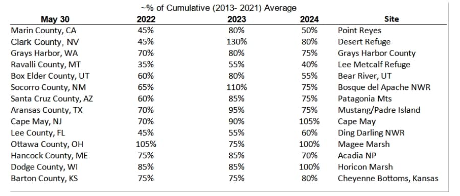 Casting a wider net, I researched fourteen birding hotspots, not necessarily representative of the entire country, with these cumulative results versus historical averages as of May 30 of each year: