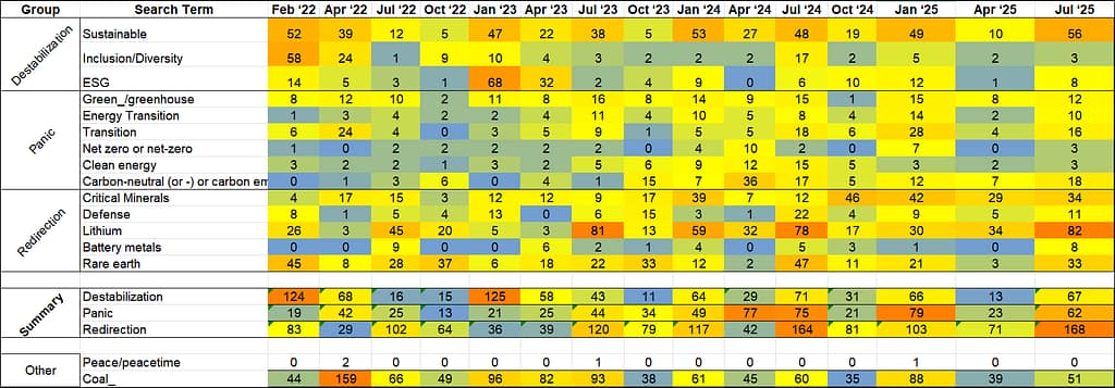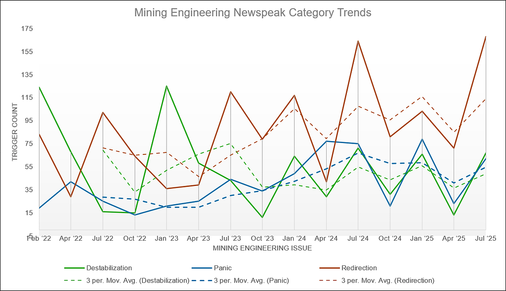 By my nature a habitual miner, three parts geo and 1 part engineer, my reaction to the situation is to tabulate and chart the Newspeak terms with metrics1. Table 1 shows total occurrences of search terms related to the Narrative(s) at ± quarterly intervals as published in Mining Engineering issues over the last three years. Consider it a heat map of virtue-signaling wokeness, leavened with uncritical thinking, with a dash of greed for good measure, and, from a conspiracy angle, designed to evoke reaction from grumpy old dinosaurs. The narratives pushed by all the different useful agents and tools first knock the legs out from under the way we think and do business, then present and react to a crisis, and finally propose a solution. For those who know how this all works and who set these agendas in motion, there’s money and power to be had at each step. The reward for the technical foot soldiers; e.g., management, workers, geologists and engineers, is being happy for a time helping to “solve” the latest crisis. The chart is divided into three regions which can be thought of Destabilization (top), Panic (Middle), and Redirection (Bottom).